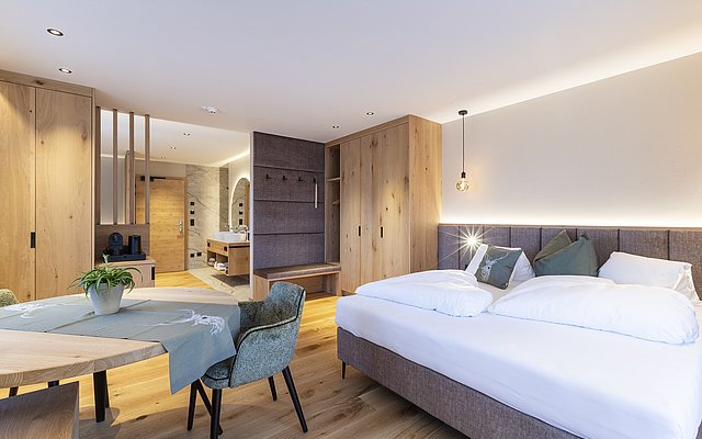 Unsere brandneue Family Suite bietet auf 45 m² großzügigen Raum für Ihren entspannten Urlaub. Der stilvolle Wohnbereich lädt mit einer gemütlichen Couch-Ecke und eigenem Flachbildfernseher zum Verweilen ein. Besonders praktisch: Der Couch-Bereich kann auf Wunsch abgetrennt werden und bietet so einen idealen Schlafplatz für Ihre Kinder – für mehr Privatsphäre und Flexibilität.