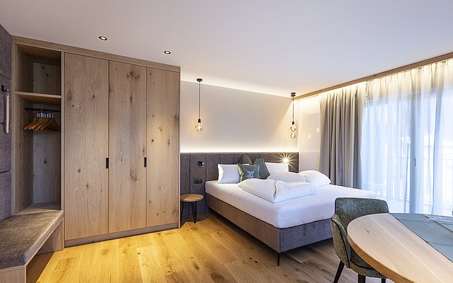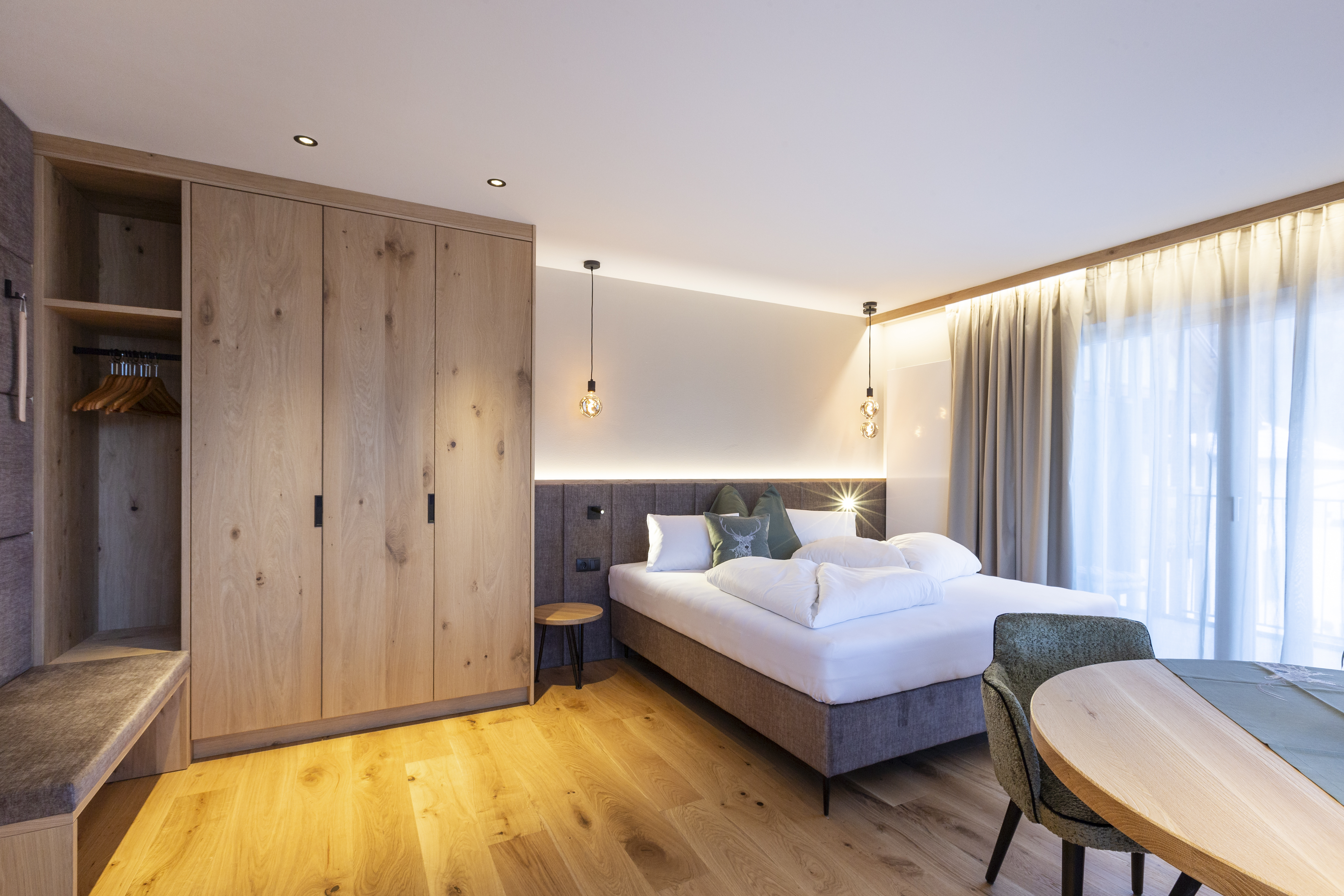 Genießen Sie die frische Luft und herrliche Aussicht auf dem großen Balkon, der Ihnen zusätzlichen Raum für Entspannung bietet. Das neu eingerichtete Badezimmer besticht durch moderne Ausstattung und hochwertige Materialien. Der edle Eichenboden und die eleganten Eichenmöbel verleihen der Suite eine warme, natürliche Atmosphäre, die zu einem erholsamen Aufenthalt für die ganze Familie einlädt.